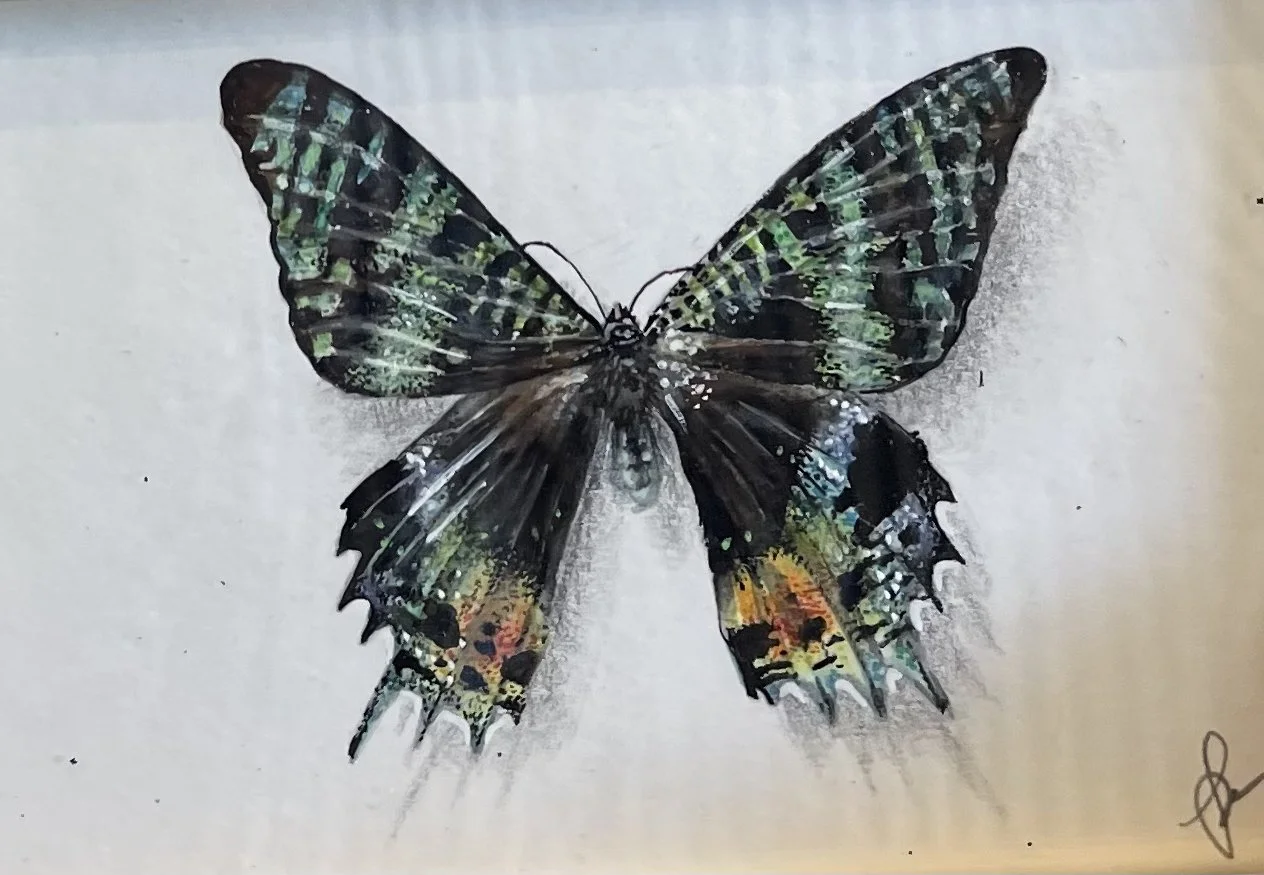 This watercolour Madagascan Sunset Moth really does look like a sunset, with a little sparkle included! At 14.5 × 10.5cm already framed this piece is sure to add the perfect amount of colour to any space.