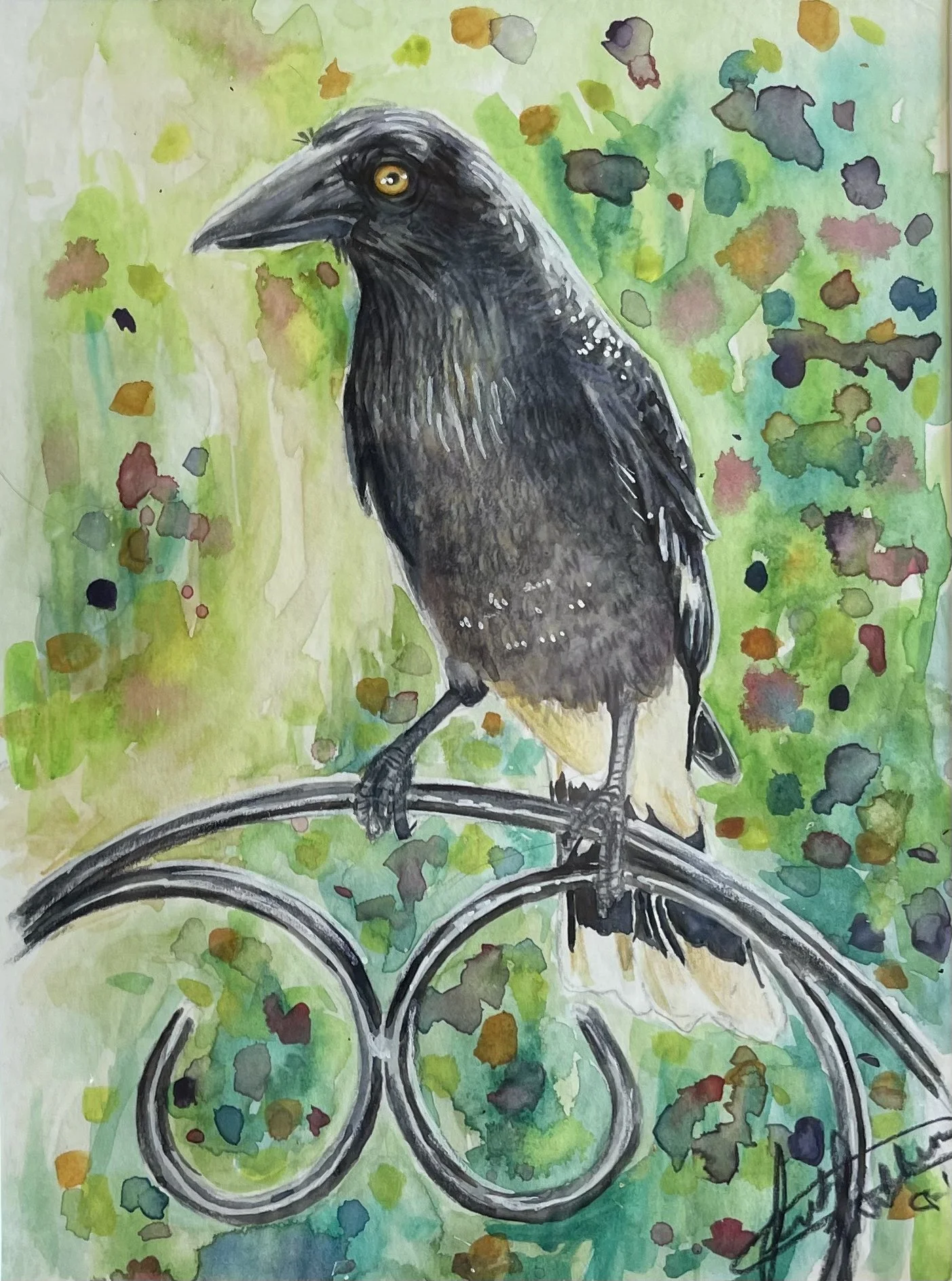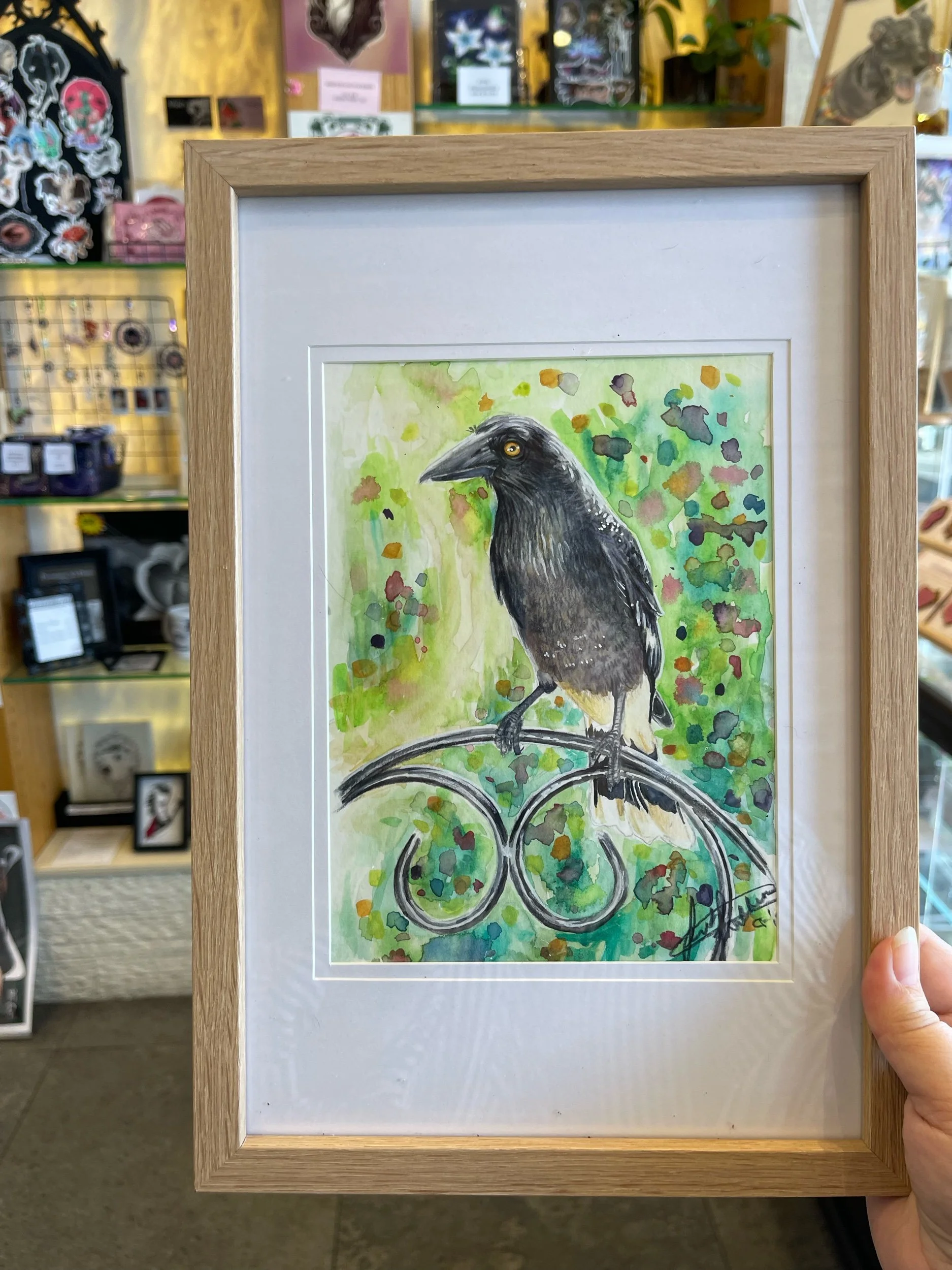 This beautiful 14.8 × 21cm piece is a watercolour depicting our guest at a local cafe. A coffee connoisseur Currawong. Framed and ready to keep you company.